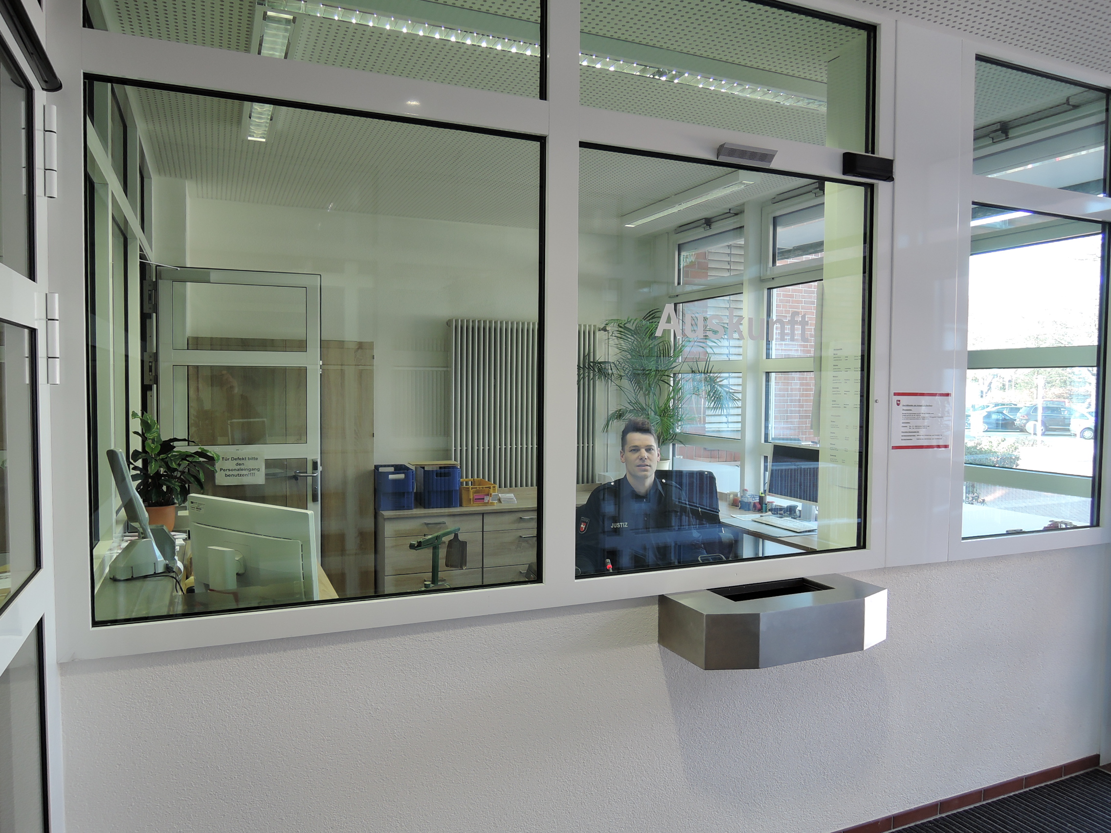 Bei dem Nachtbriefkasten vor dem Eingang zum Amtsgericht befindet sich der Einwurfschlitz in einer Höhe, die auch für Rollstuhlfahrer gut zugänglich ist. Eine taktile Beschriftung ist nicht vorhanden.